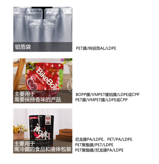 材質(zhì):PET鍍鋁/BOPP/PET/CPP/LDPE多層復合(可定制)